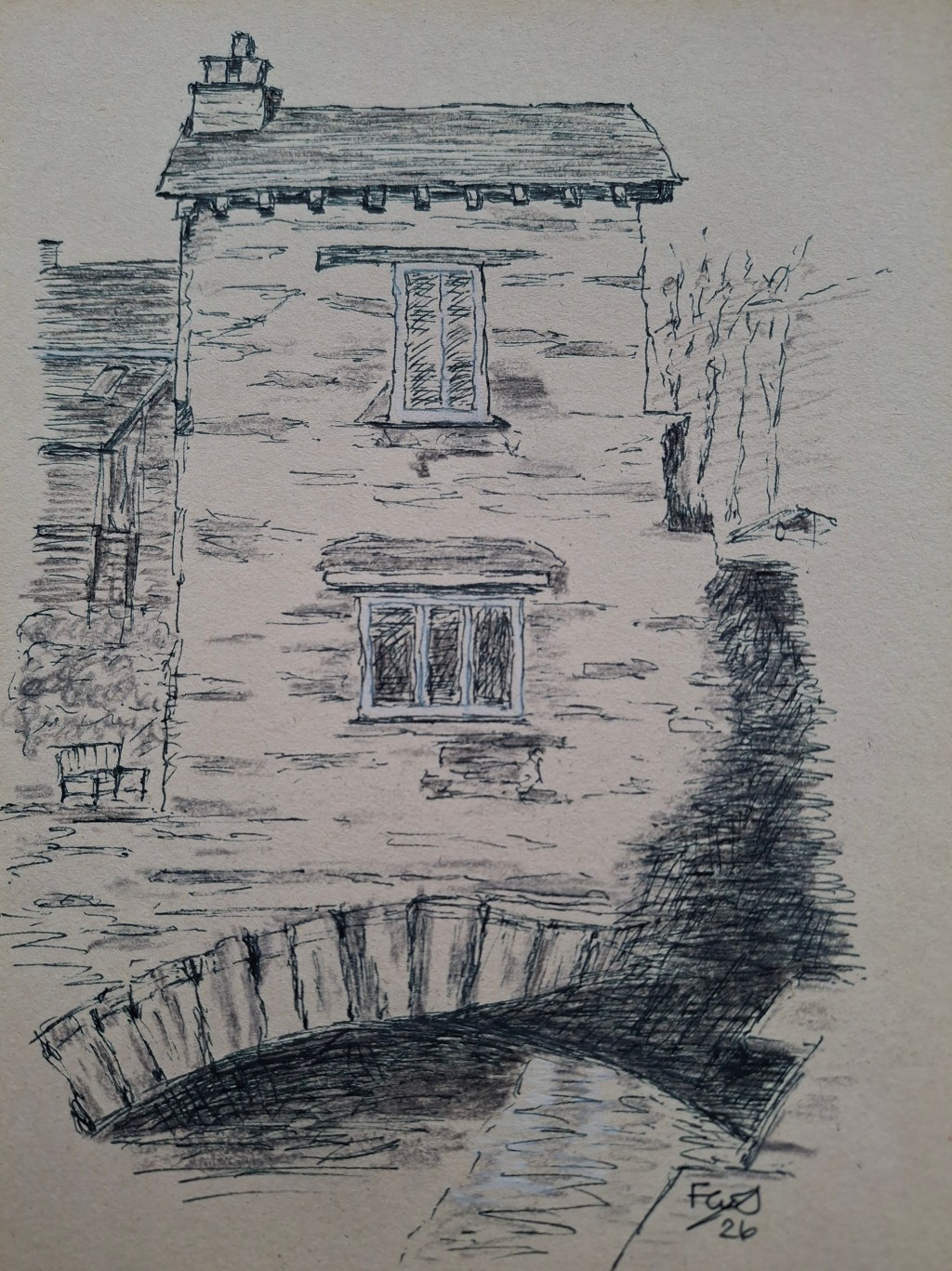 So I grabbed paper, fineliner pen and a photo I took of the Bridge House at Ambleside a few days ago and set to work to produce this. The proportions aren’t 100% accurate but as this was freehand with no tracing or under-drawing I’m really pleased with it.